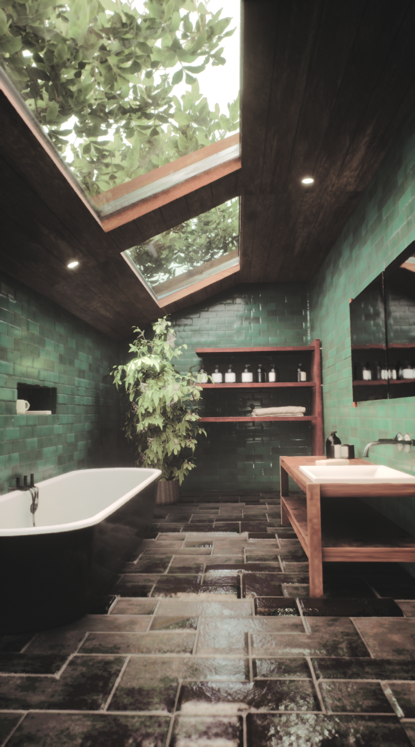 The third photo is my finished product where everything comes together with all the final details, refined materials, and polished lighting. The warm wood ceiling, the rich teal tiles, all the small touches that make it feel complete.